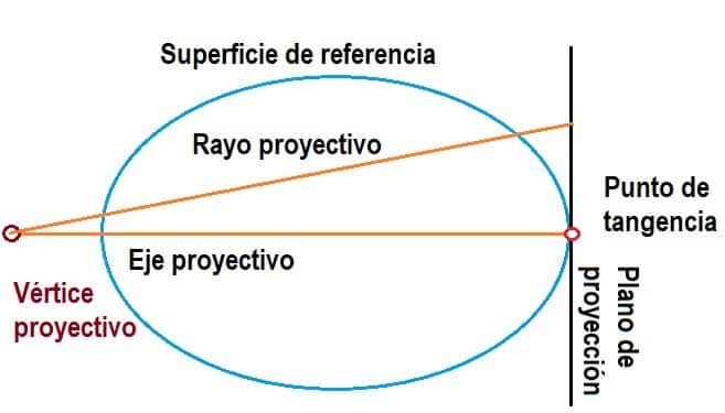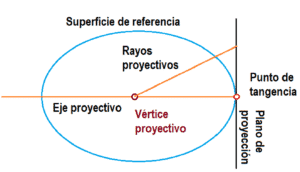El plano de proyección: Esta es la superficie donde se describe la figura a proyectar. De acuerdo a la ubicación del punto de tangencia del plano de proyección se denomina proyecciones polares, ecuatoriales u oblicuas.