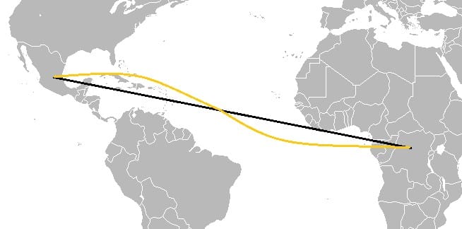 Por otro lado, las líneas ortodrómicas si expresan la distancia más corta entre dos puntos. La proyección de las líneas ortodrómicas se representa como líneas curvas excepto el plano del Ecuador y el Meridiano central, que son líneas rectas. Son muy útiles para fines de navegación.