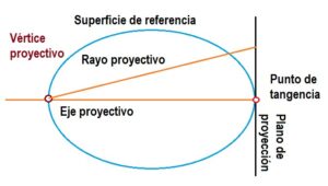 La proyección central tiene el vértice proyectivo en el centro de la superficie de referencia.