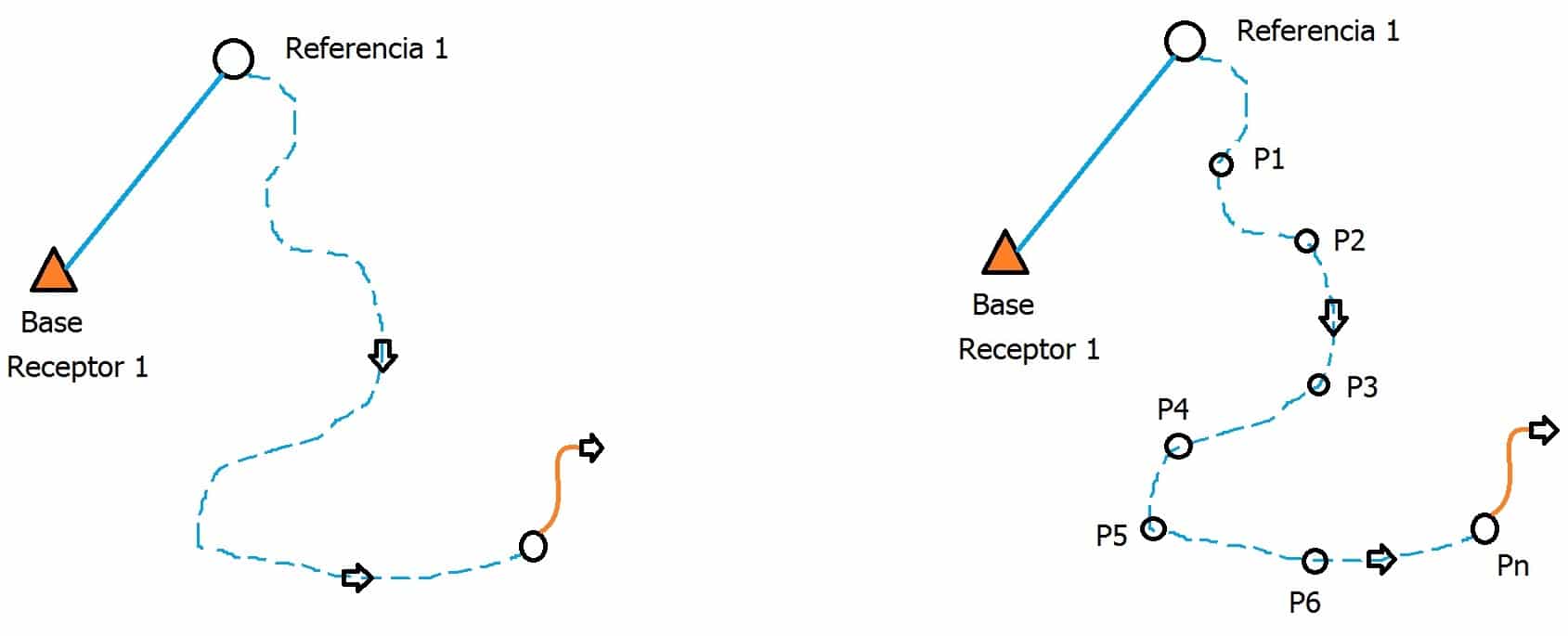 Luego de la inicialización de los receptores, el receptor base debe permanecer en el vértice de coordenadas conocidas y el segundo receptor se desplazará libremente a lo largo de una línea o a los vértices de coordenadas desconocidas.