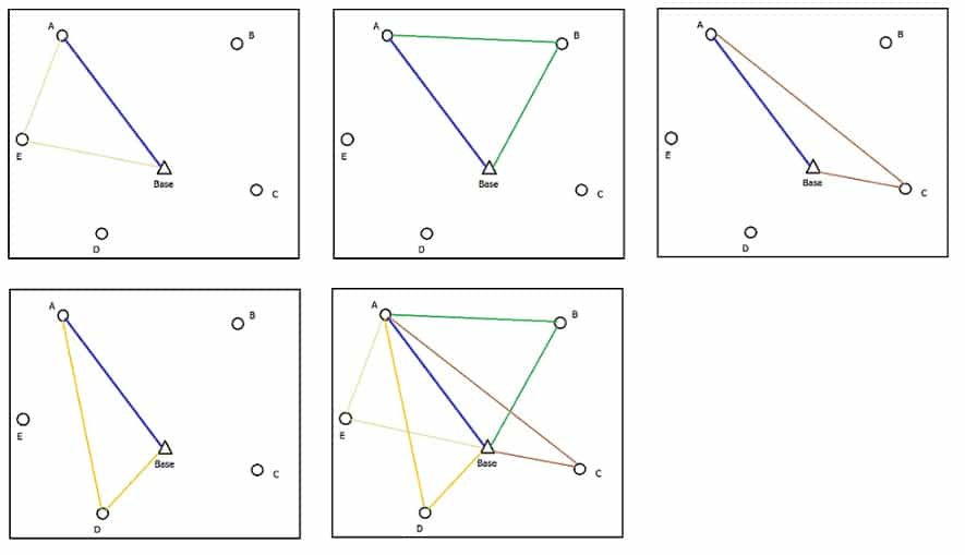 Podría utilizarse esta otra forma de ocupación de vértices utilizando tres receptores donde un receptor se ubicará en el vértice con coordenadas conocidas y los dos receptores en los vértices de coordenadas desconocidas. En este caso cada sesión de observación se realizará en triángulos cuyos vértices serán ocupados por cada receptor.